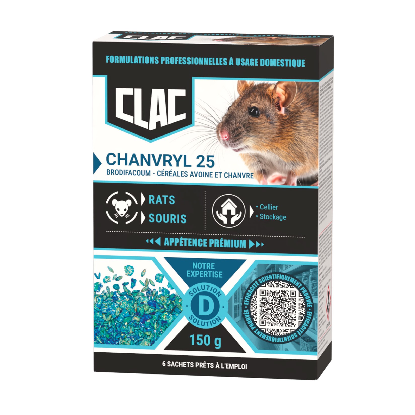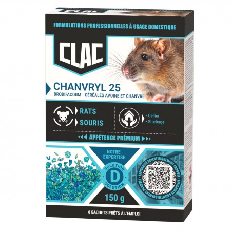 CHANVRYL 25 est un rodenticide à base de brodifacoum, spécialement conçu pour éliminer efficacement les rats et les souris. Grâce à son mélange attractif d’avoine et de chanvre, cet appât offre une très forte appétence, même en présence d’autres sources de nourriture, favorisant une ingestion rapide.